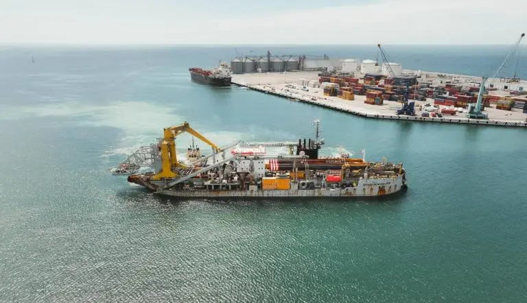 La mega draga —propiedad de un consorcio europeo especializado en infraestructura marítima avanzada— es una draga de succión y construcción con potencia instalada de 23,000 kilowatts, equivalente a 30,800 caballos de fuerza efectivos bajo condiciones de carga continua. Con 138.5 metros de eslora, sus capacidades de dragado están diseñadas para ejecutar remociones de gran volumen en fondos con alta compactación. Durante la primera etapa, intervendrá más de un millón de metros cúbicos de piedra, volumen comparable a 400 albercas olímpicas, utilizando tecnología automatizada de precisión batimétrica.