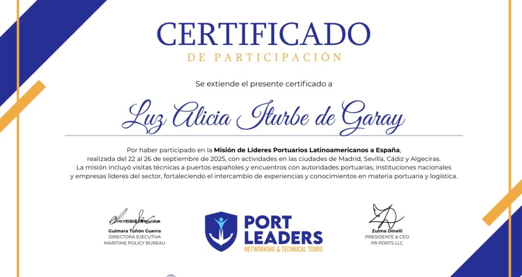 Certificado de Participación A la Dra. Luz Alicia Iturbe de Garay. Por haber participado en la Misión de Líderes Portuarios Latinoamericanos a España, 2025